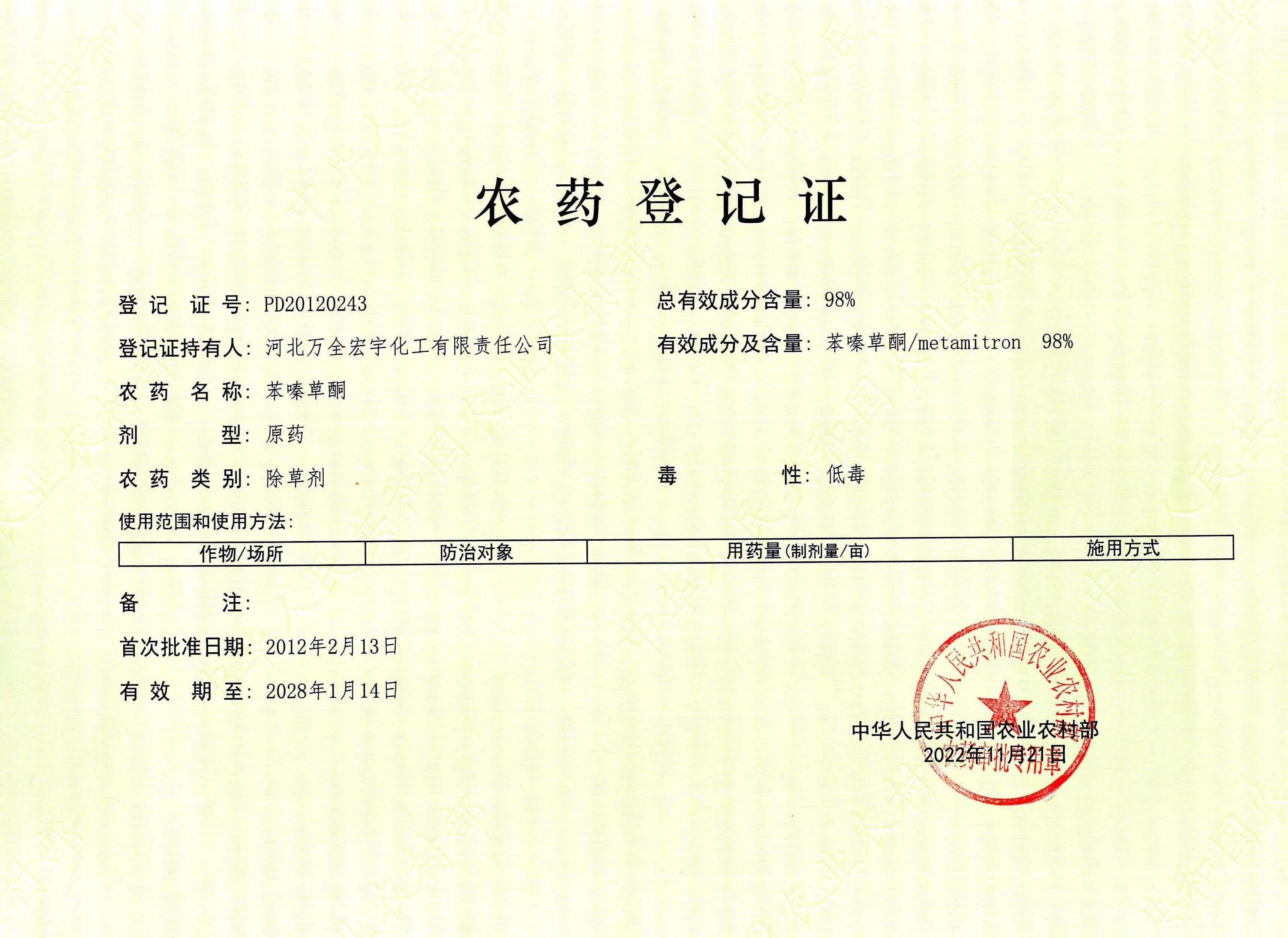 98%苯嗪草酮原药登记证-2022