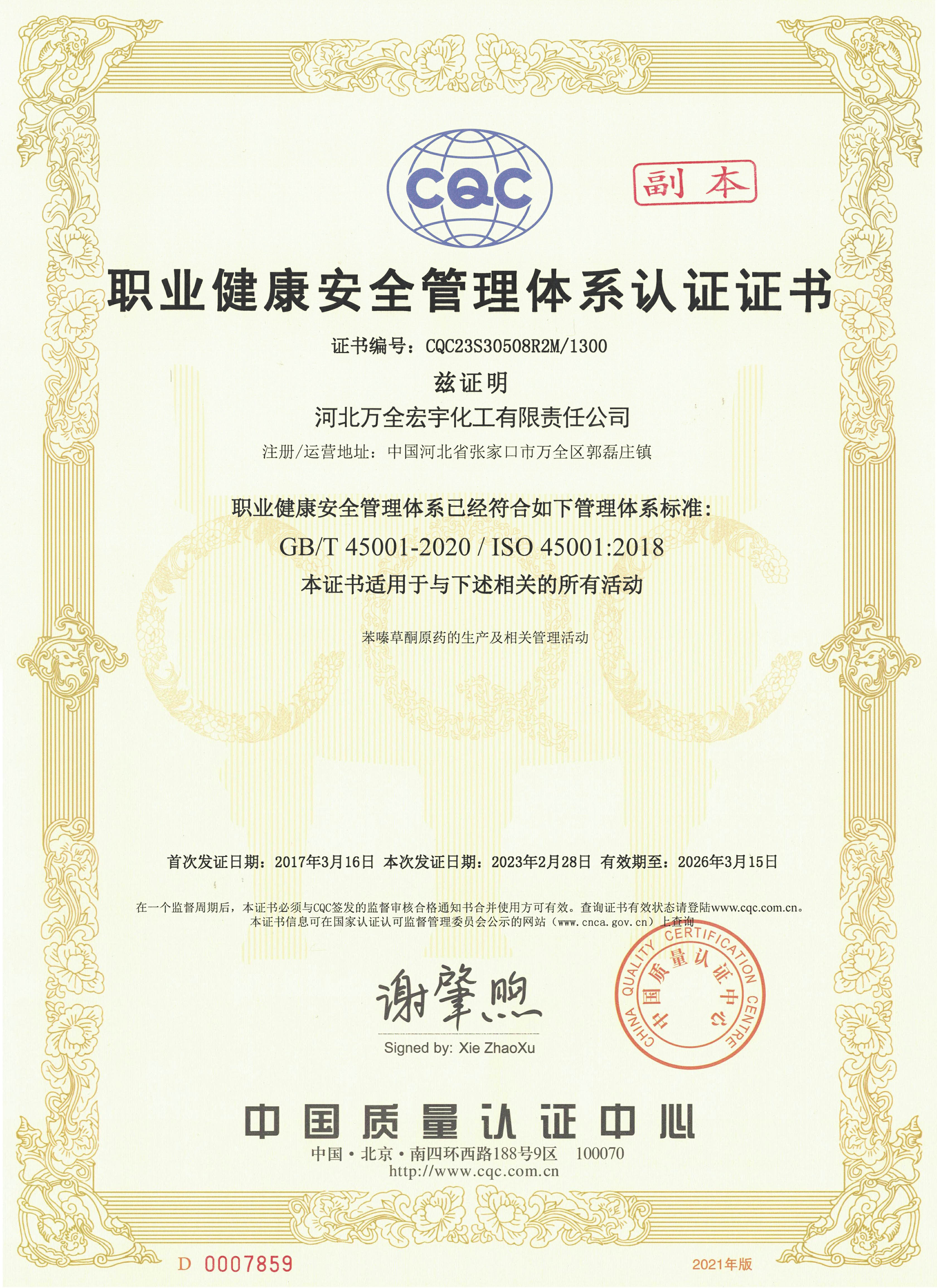 职业健康安全管理体系证书-中文副本